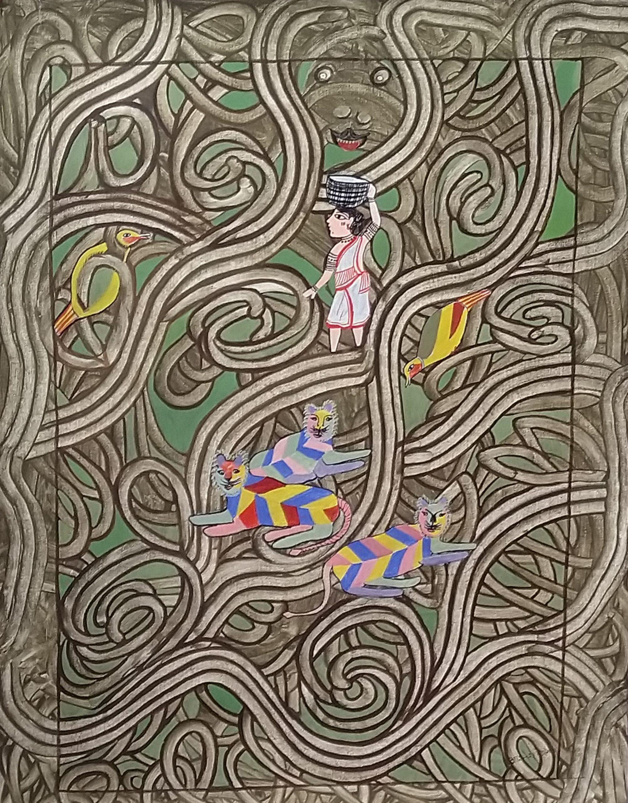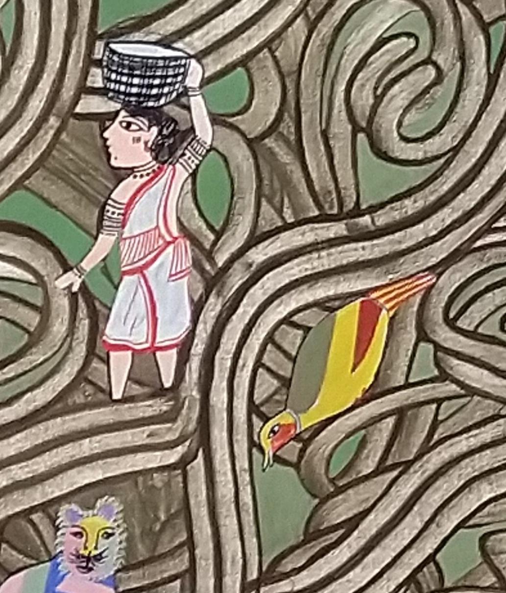 Agnesh Kerketta est née dans les années 80 près de Jashpur (elle ne connait pas son âge exact et n’a pas eu l’occasion d’apprendre à lire et à écrire) dans l’Etat du Chatisgarh. Elle est soutenue par le ‘‘Indira Gandhi National Museum of Man Kind’’ à Bhopal. Jusqu’à l’âge de 30 ans, ses oeuvres sont exclusivement inspirées des peintures murales rituelles de sa tribu. Elle y a découvert l’art du mouvement (ses peintures sont généralement composées d’un arrière-plan qui rappelle les tracés en arcs de cercle sur les murs des maisons). Aujourd’hui, ses oeuvres sont aussi une manière de transcrire les histoires et les mythes que, toute petite, son grand-père lui racontait.