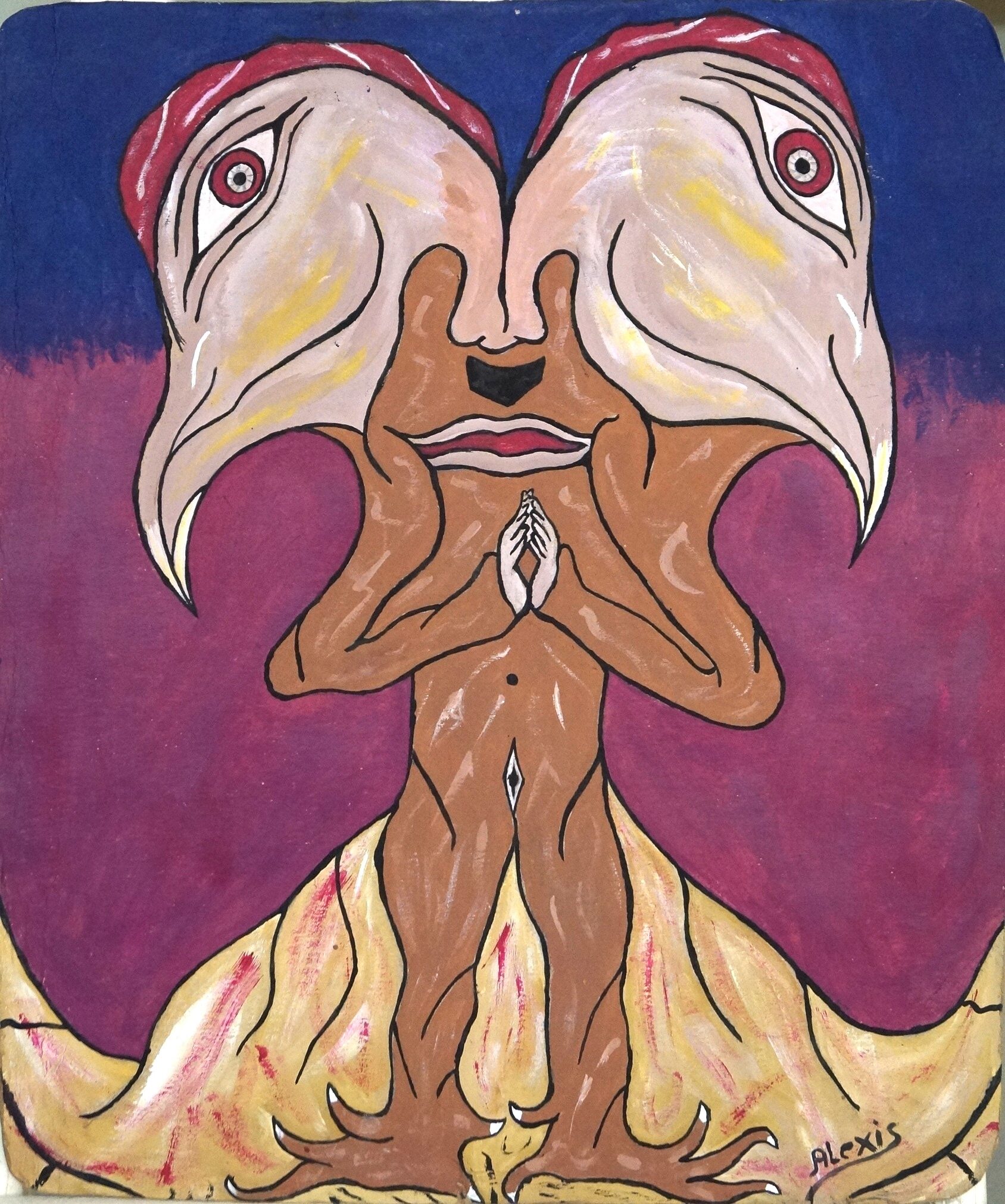 Je travaille sur le vodou ,ces le culture de mon pays, mon travail basé sur le mister comme danmbala, criminel, exct ,je me sens très fier d’être un artiste en art brut et j’ai commencé à travailler depuis février 2011 ce n’est pas facile de commencer mais en regardant les artiste comme Guyodo et d’autre entrain de travailler ça me donne impulsion de devenir comme eux.mon premier oeuvre d’art était inspirer par danmbala c’etait un grand début pour moi de le peindre avec passion et amour c’est pour cela que toute mes œuvres d’art vient de l’histoire vodou haïtienne.