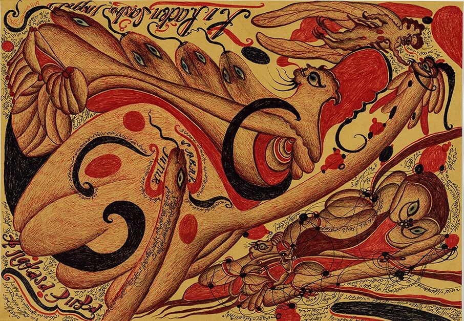 Il crée suivant son intuition, en utilisant papiers trouvés, stylos à bille et crayons.