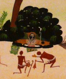 BalaSubramania est un des peintres majeurs des Kurumbas. Il vit dans le village de Mettukalai près de Kotagiri où il anime l’école de peinture créée à l’initiative de la Fondation CP ART. Il est avant tout agriculteur. Ses peintures illustrent principalement des scènes rituelles qui appartiennent son clan. Il utilise uniquement des pigments végétaux ou minéraux collectés dans la forêt qui entoure son village.