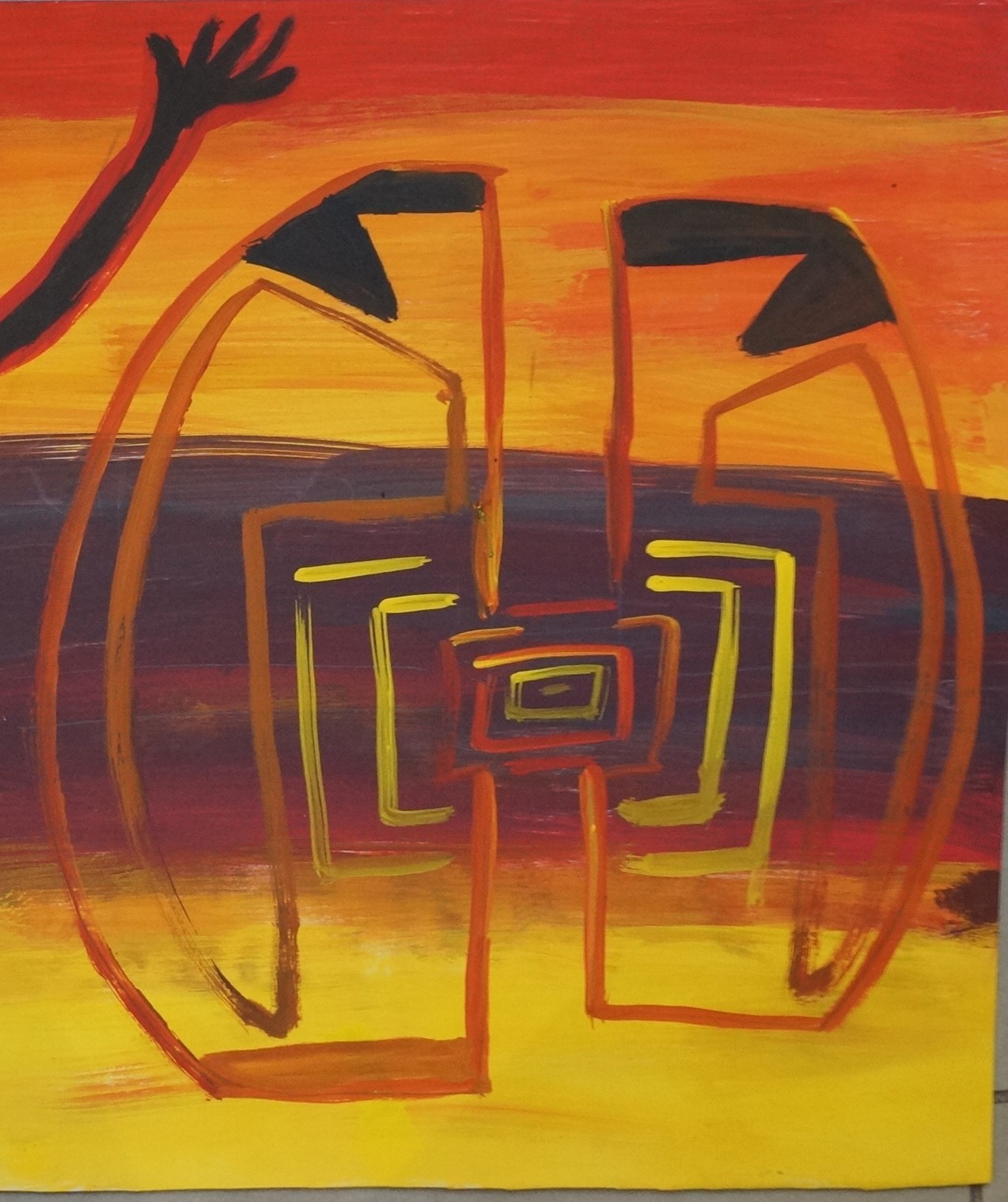 Il faut beaucoup de temps et puis un jour, la main retrouve un chemin. Les peintures de Bruce sont des leçons de clarté. Couleurs vives appliquées sur des surface planes, des ciels, des mers, des collines, que rien ne trouble . Ses christs montés en croixn’ inspirent plus de réels soucis, et pourtant la lance les a frappés….