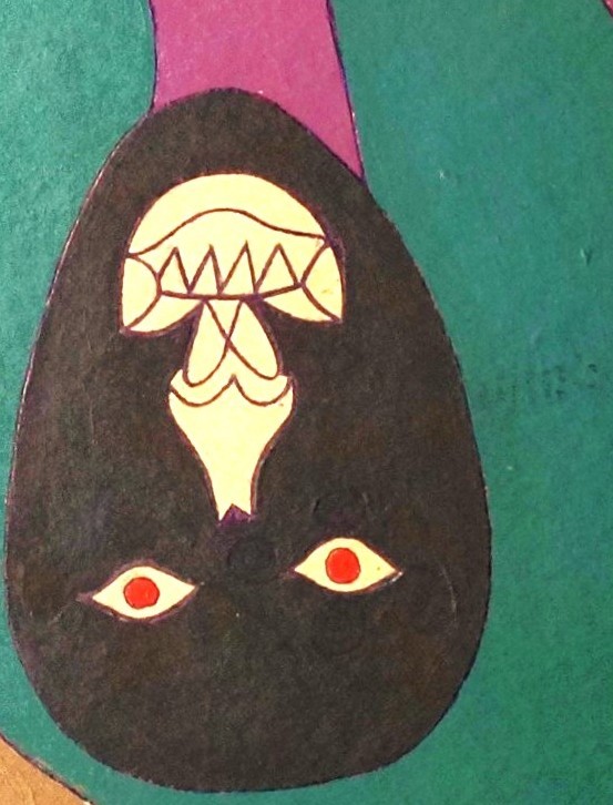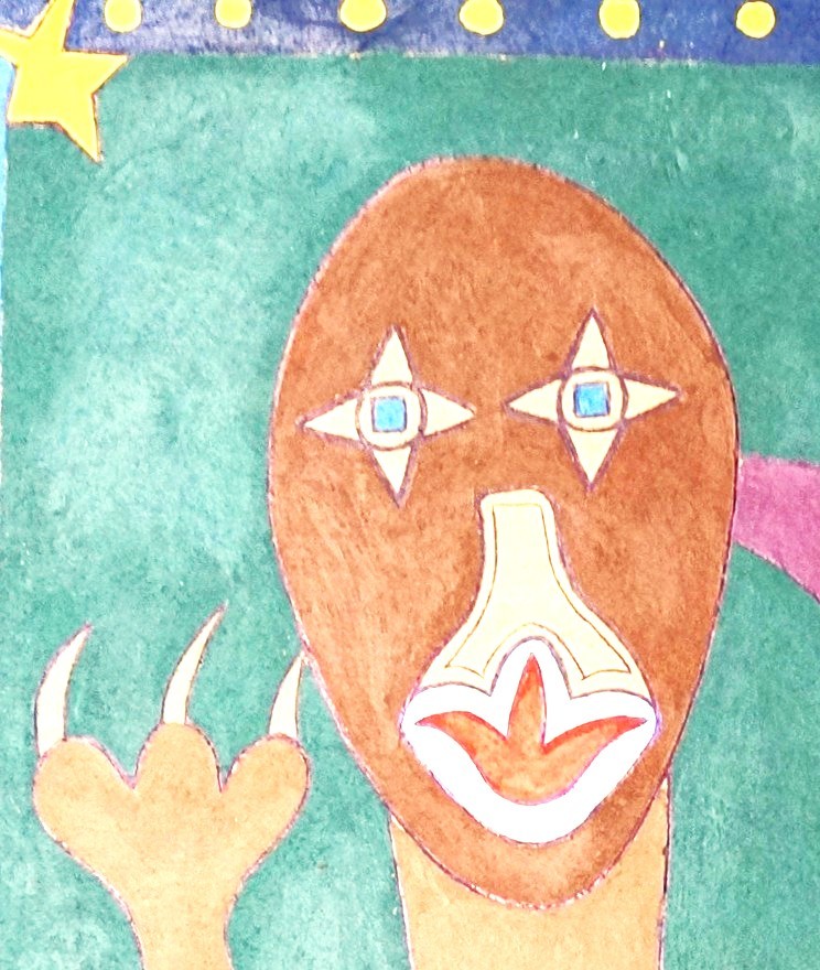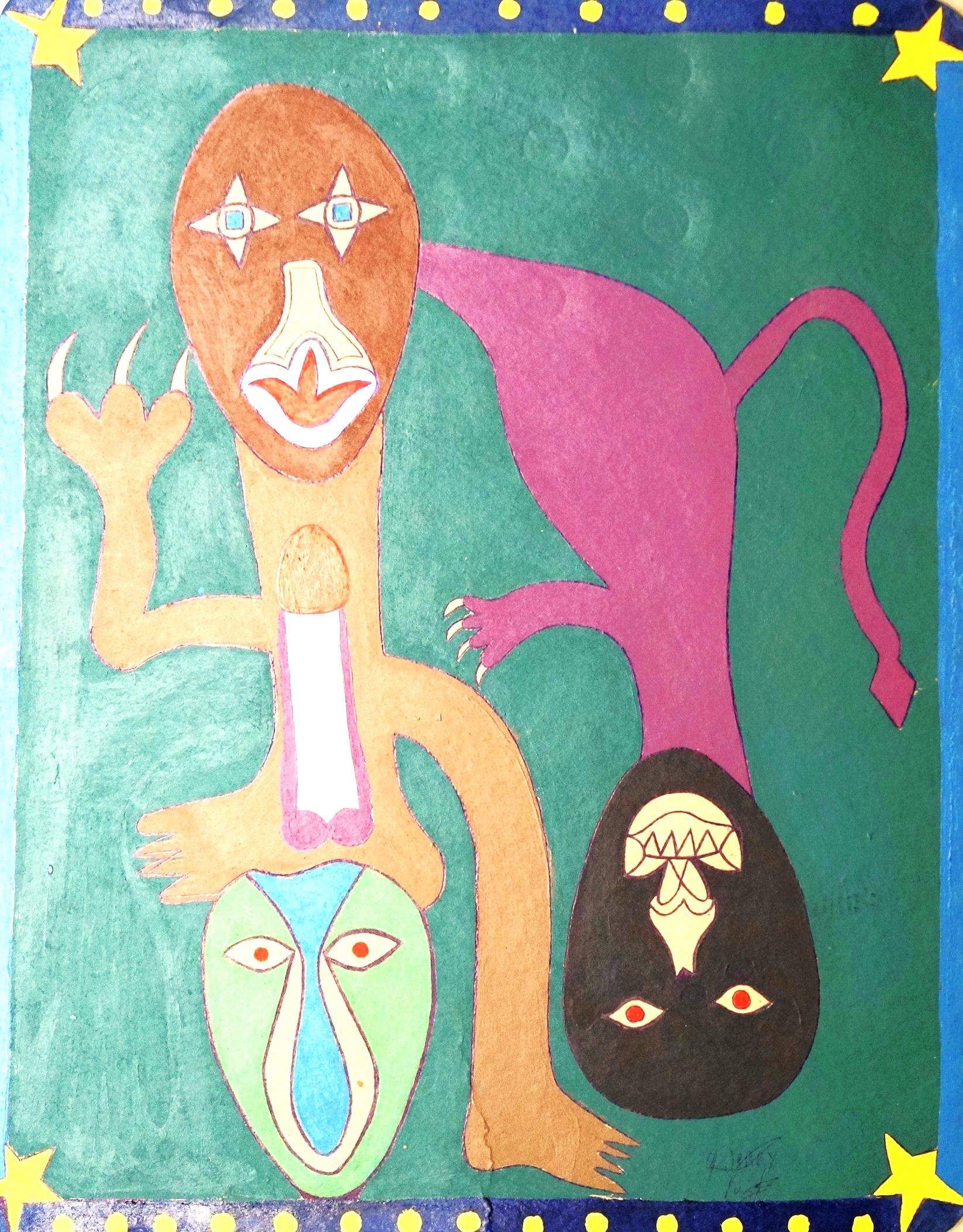 Son œuvre est immédiatement reconnaissable. Sur carton, à l’acrylique et au stylo-bille, Charles Djerry déploie un bestiaire foisonnant et un monde de figures mythologiques où se croisent oiseaux enchaînés, serpents, têtes de mort et diables verts. Les vévés — ces symboles vaudou qui nomment et invoquent les esprits — irriguent ses compositions de leur puissance graphique. Ses toiles vivement colorées, aux formes nettes et tranchées, sont à la fois des portraits mythologiques et des portes ouvertes sur le monde des esprits.
