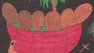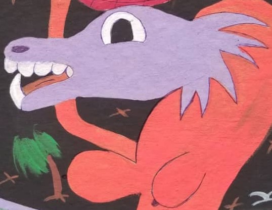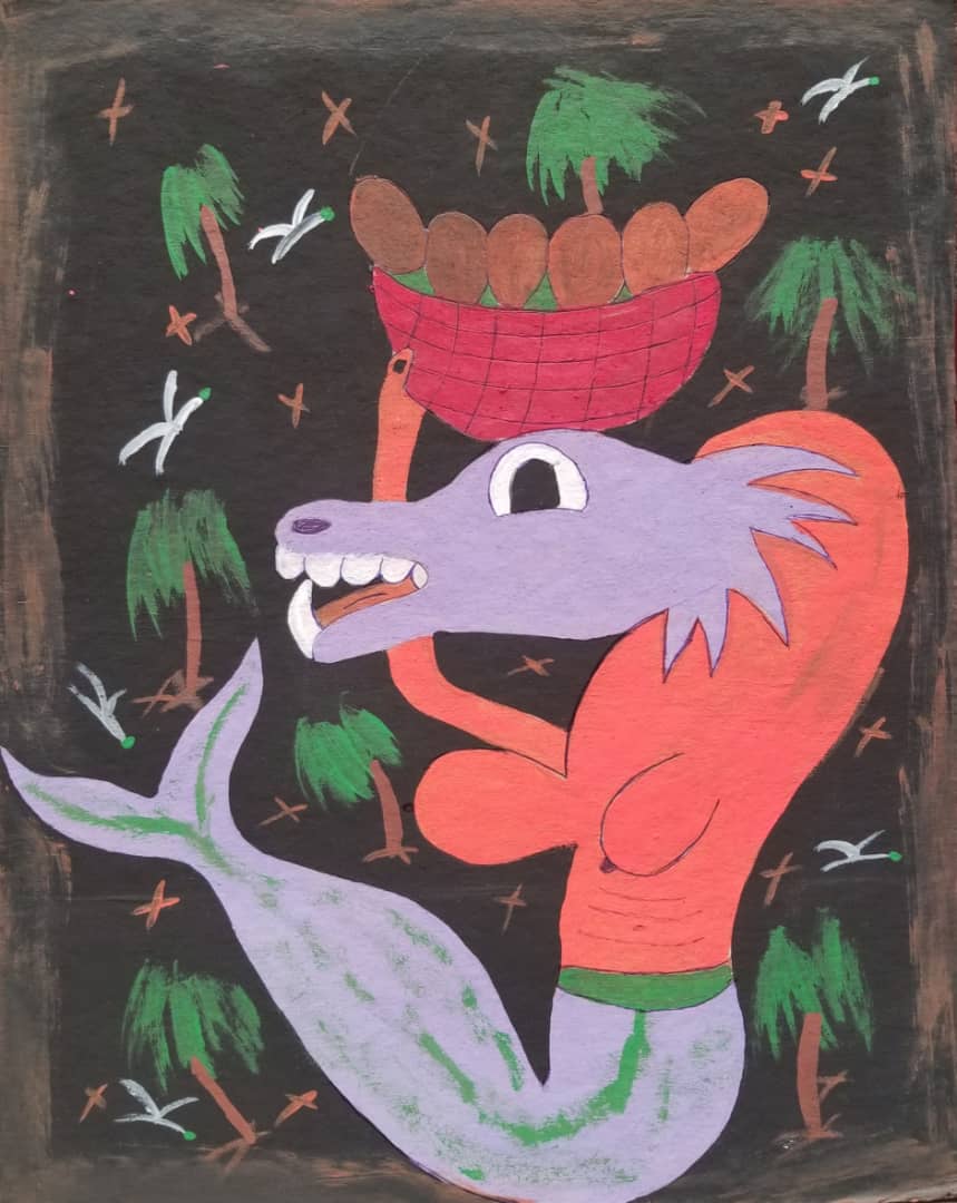 Son œuvre est immédiatement reconnaissable. Sur carton, à l’acrylique et au stylo-bille, Charles Djerry déploie un bestiaire foisonnant et un monde de figures mythologiques où se croisent oiseaux enchaînés, serpents, têtes de mort et diables verts. Les vévés — ces symboles vaudou qui nomment et invoquent les esprits — irriguent ses compositions de leur puissance graphique. Ses toiles vivement colorées, aux formes nettes et tranchées, sont à la fois des portraits mythologiques et des portes ouvertes sur le monde des esprits.