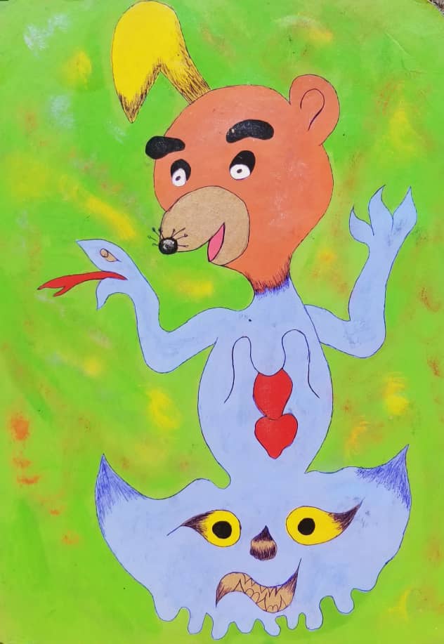Son œuvre est immédiatement reconnaissable. Sur carton, à l’acrylique et au stylo-bille, Charles Djerry déploie un bestiaire foisonnant et un monde de figures mythologiques où se croisent oiseaux enchaînés, serpents, têtes de mort et diables verts. Les vévés — ces symboles vaudou qui nomment et invoquent les esprits — irriguent ses compositions de leur puissance graphique. Ses toiles vivement colorées, aux formes nettes et tranchées, sont à la fois des portraits mythologiques et des portes ouvertes sur le monde des esprits.