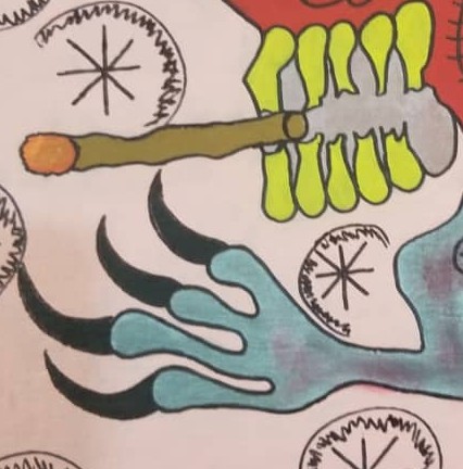 Son œuvre est immédiatement reconnaissable. Sur carton, à l’acrylique et au stylo-bille, Charles Djerry déploie un bestiaire foisonnant et un monde de figures mythologiques où se croisent oiseaux enchaînés, serpents, têtes de mort et diables verts. Les vévés — ces symboles vaudou qui nomment et invoquent les esprits — irriguent ses compositions de leur puissance graphique. Ses toiles vivement colorées, aux formes nettes et tranchées, sont à la fois des portraits mythologiques et des portes ouvertes sur le monde des esprits.