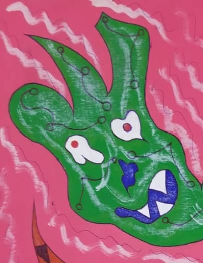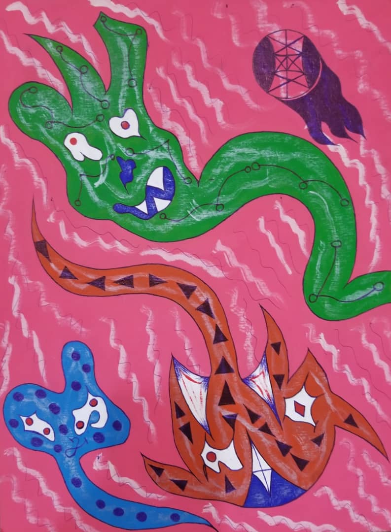 Son œuvre est immédiatement reconnaissable. Sur carton, à l’acrylique et au stylo-bille, Charles Djerry déploie un bestiaire foisonnant et un monde de figures mythologiques où se croisent oiseaux enchaînés, serpents, têtes de mort et diables verts. Les vévés — ces symboles vaudou qui nomment et invoquent les esprits — irriguent ses compositions de leur puissance graphique. Ses toiles vivement colorées, aux formes nettes et tranchées, sont à la fois des portraits mythologiques et des portes ouvertes sur le monde des esprits.