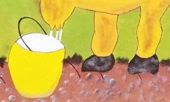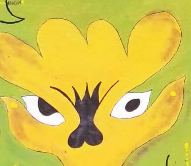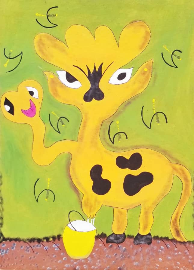 Son œuvre est immédiatement reconnaissable. Sur carton, à l’acrylique et au stylo-bille, Charles Djerry déploie un bestiaire foisonnant et un monde de figures mythologiques où se croisent oiseaux enchaînés, serpents, têtes de mort et diables verts. Les vévés — ces symboles vaudou qui nomment et invoquent les esprits — irriguent ses compositions de leur puissance graphique. Ses toiles vivement colorées, aux formes nettes et tranchées, sont à la fois des portraits mythologiques et des portes ouvertes sur le monde des esprits.