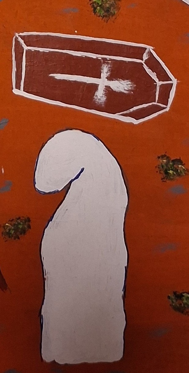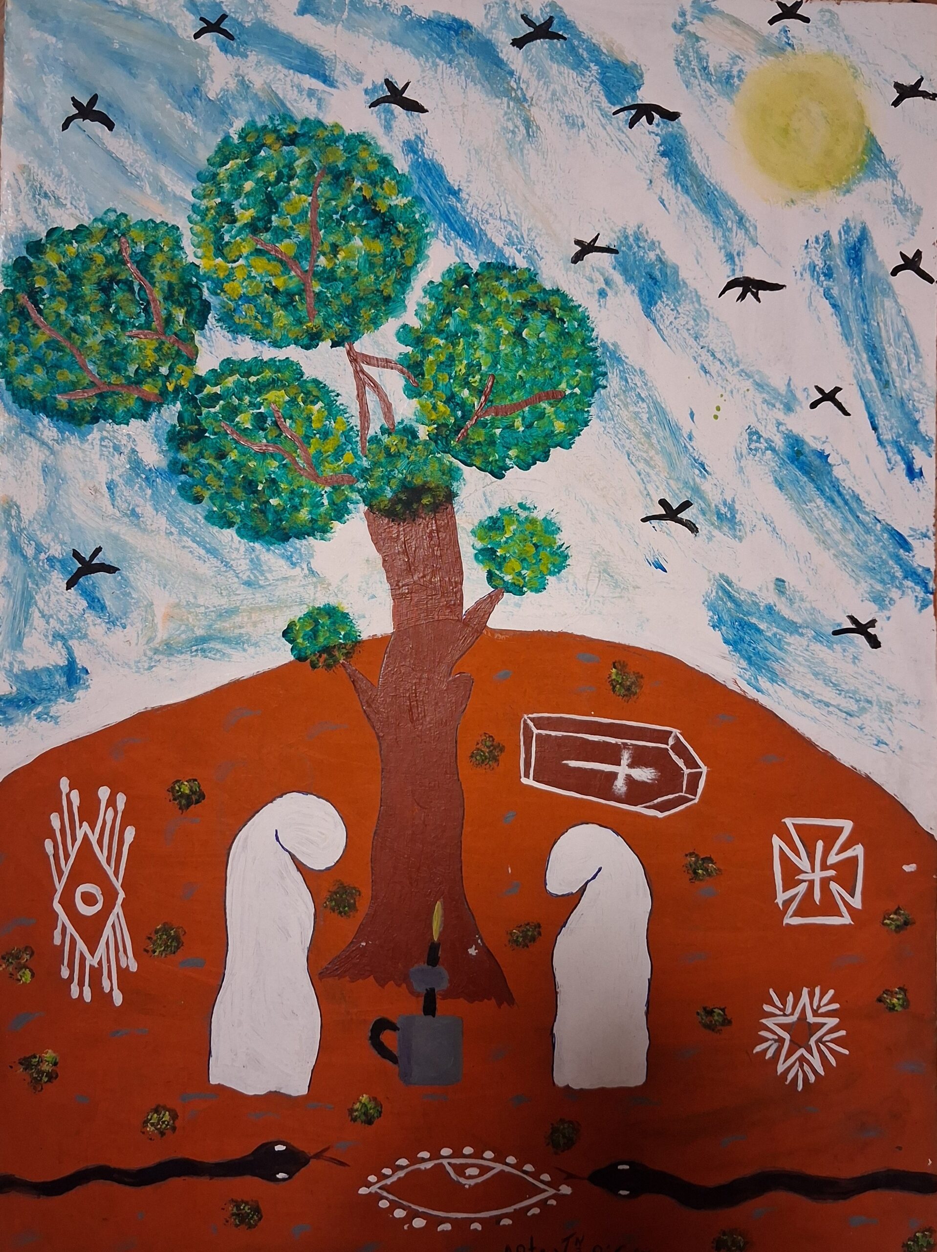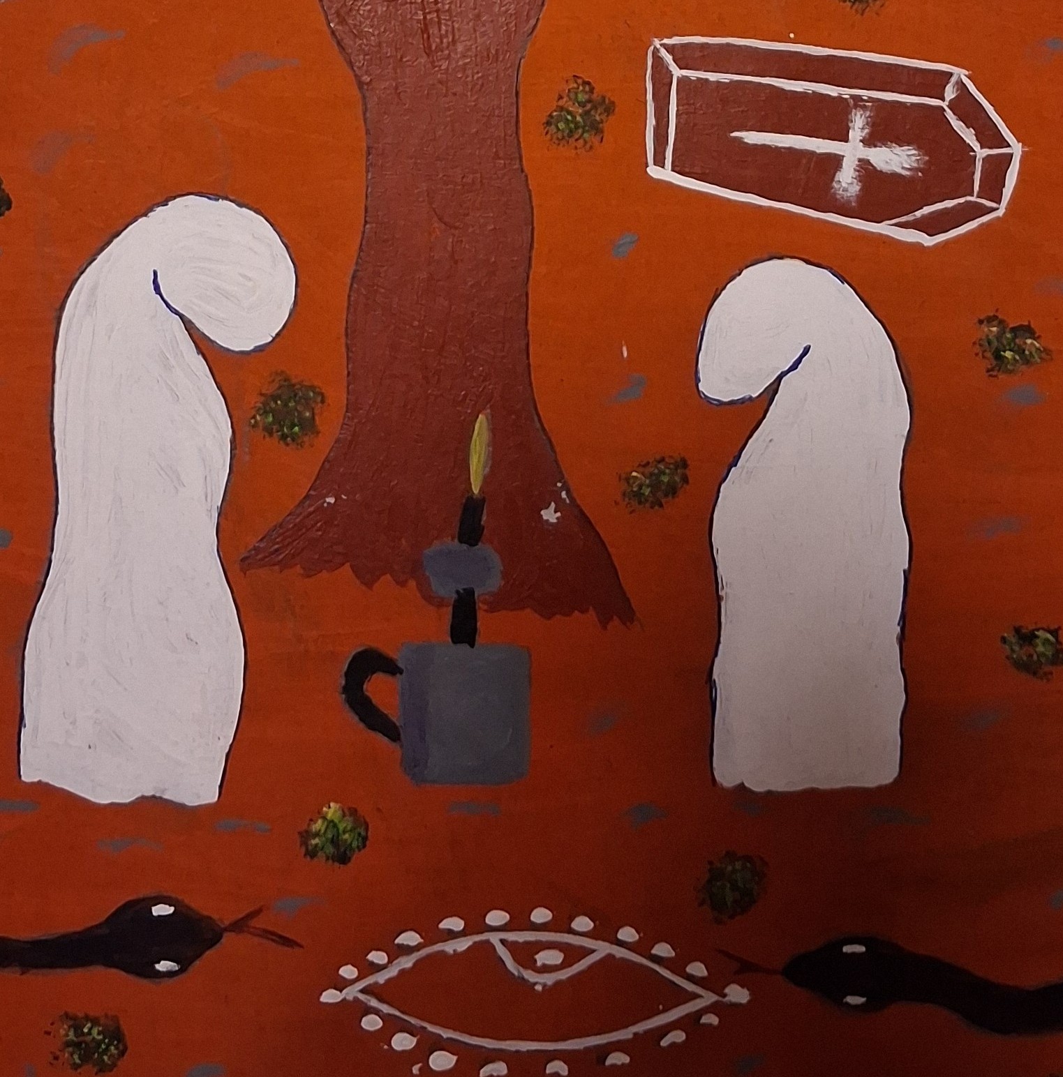 Son œuvre est immédiatement reconnaissable. Sur carton, à l’acrylique et au stylo-bille, Charles Djerry déploie un bestiaire foisonnant et un monde de figures mythologiques où se croisent oiseaux enchaînés, serpents, têtes de mort et diables verts. Les vévés — ces symboles vaudou qui nomment et invoquent les esprits — irriguent ses compositions de leur puissance graphique. Ses toiles vivement colorées, aux formes nettes et tranchées, sont à la fois des portraits mythologiques et des portes ouvertes sur le monde des esprits.