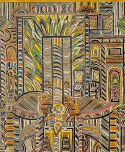 Personnage atypique, atteint d’un handicap, Mazin se réfugie dans la construction de son propre univers parfaitement organisé, fait de lignes qui s’imbriquent les unes dans les autres. Sa seule activité est le dessin, qu’il pratique sans discontinuité pour créer des mondes parfaitement imaginaires aux couleurs chatoyantes et aux volumes improbables et incertains – comme une invitation à arpenter des sentiers impossibles. Une œuvre labyrinthique ou l’on se perd.