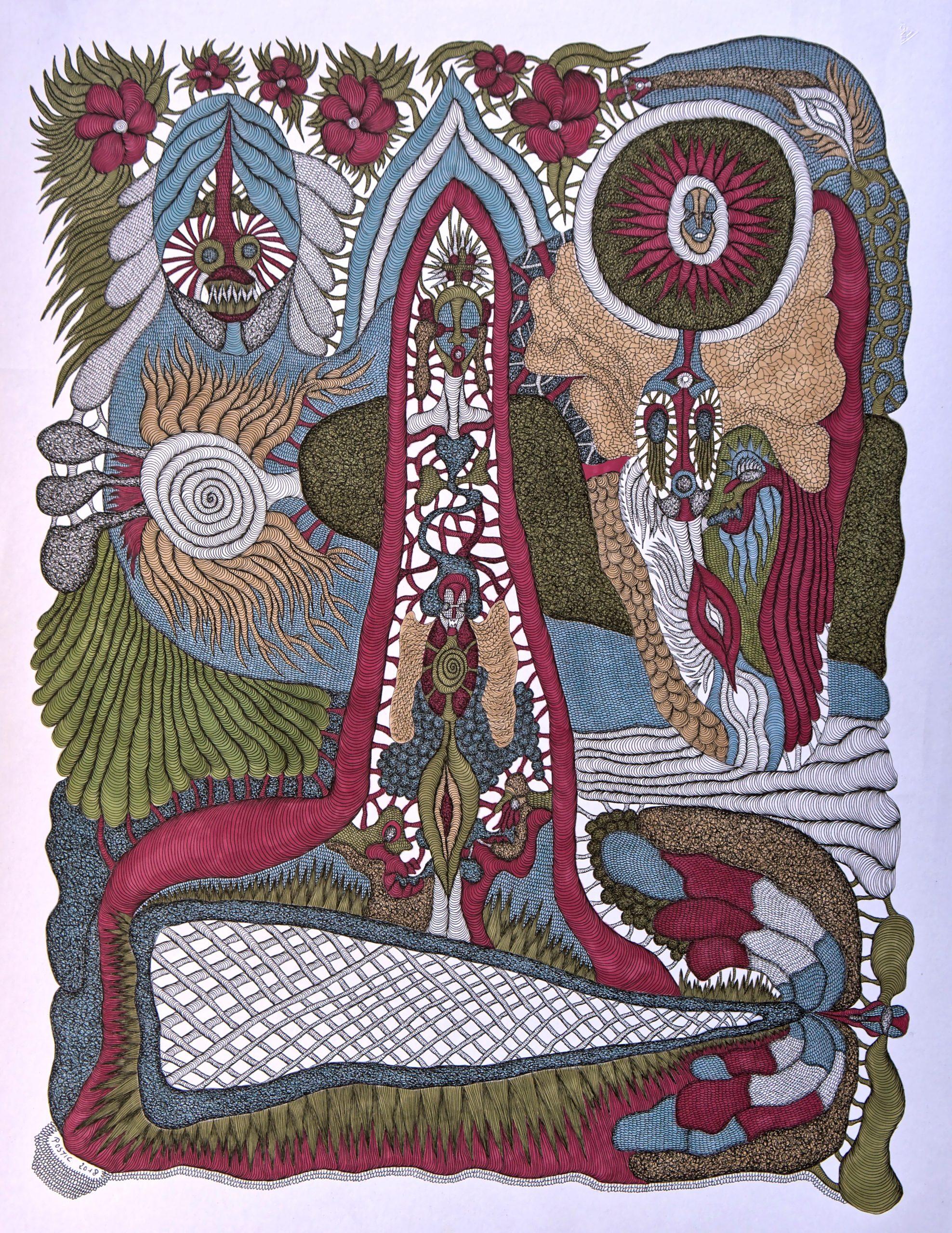 Après son divorce, Evelyne Postic s’installe à Grenoble, avec ses trois enfants, où pour échapper à un quotidien trop pesant, elle s’invente un monde parallèle, et commence à peindre et à dessiner des formes, où se mêlent l’humain, le végétal, l’animal.