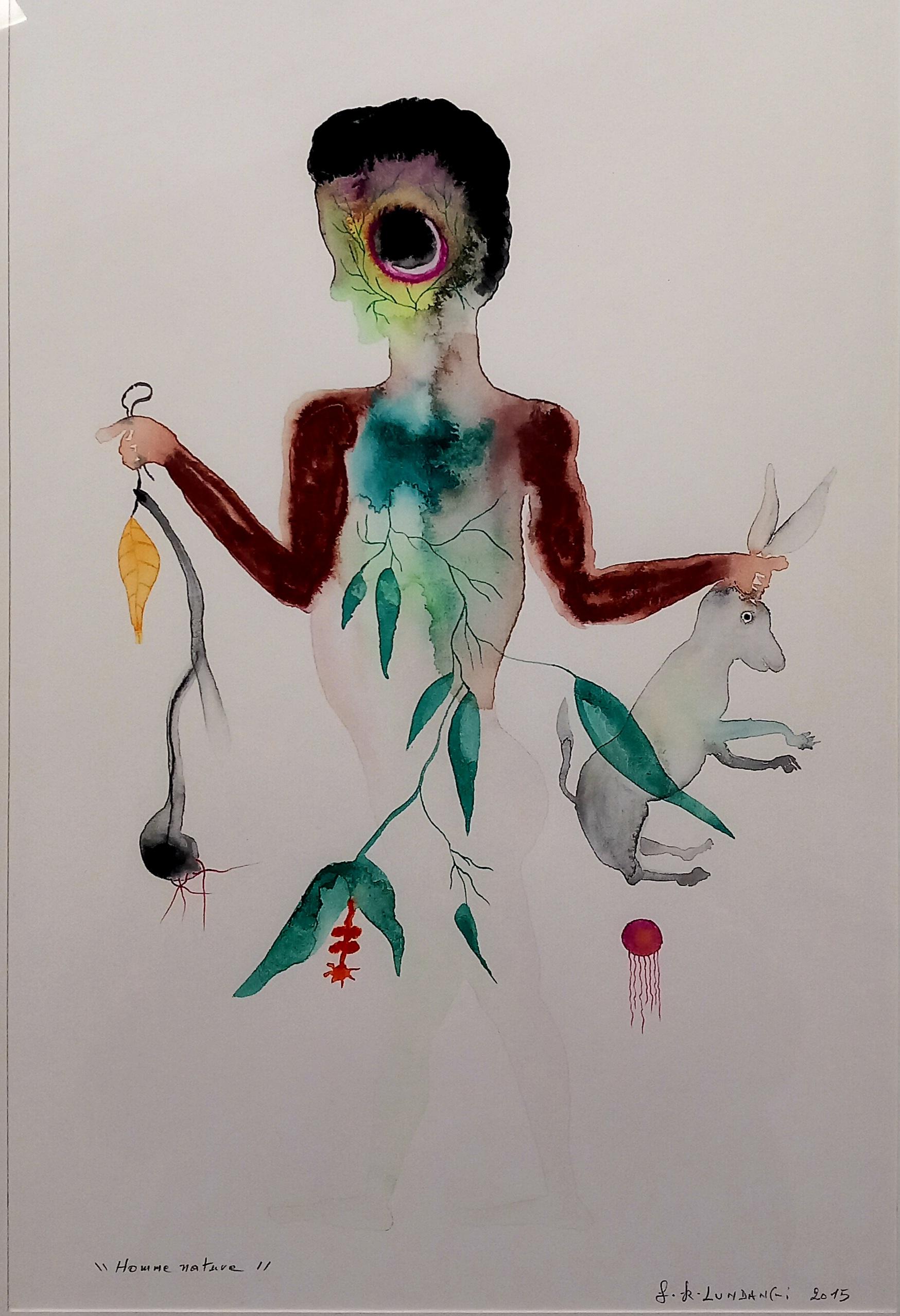 Né en 1958 à Maquela Do Zombo (Angola), Franck K. Lundangi n’a que trois ans quand ses parents choisissent de s’exiler au Zaire (République Démocratique du Congo), fuyant la guerre civile. Il ne retourne dans son pays natal que 22 ans plus tard pour intégrer l’équipe nationale de football où il jouera pendant 5 ans avant de rejoindre le Gabon. Arrivé en France en 1990, il a la révélation de sa nature profonde grâce à la rencontre deux ans plus tard de sa future épouse, Catherine, dans une communauté d’artistes des environs de Paris. L’œuvre de Ludangi est donc née tout à la fois de et dans l’exil. Elle travaille la distance réelle et intérieure qui le sépare de l’Afrique devenue territoire du souvenir et du rêve. Une Afrique qui prend corps spontanément dans un univers pictural et graphique d’une simplicité pleine de grâce et d’harmonie. Les personnages, les animaux, la végétation, les scènes de village ou de chasse sont schématisées dans des raccourcis originaux. Les symboles décoratifs empruntés au registre cosmogonique s’organisent pour établir un dialogue continu entre l’homme, la nature et le cosmos. Les couleurs sont libres et se jouent des conventions et des attentes. Elles ne sont pas affectées, même à leur insu, à telle ou telle fonction symbolique. Elles font ce qui leur chante, s’engageant dans des voies audacieuses que spontanément elles ont ouvertes, y donnant toute la mesure de leur flamboyance chromatique ou de leur caresse délicate, allant jusqu’au bout de leur énergie. La composition, la distribution des éléments figures, les raisons internes des motifs, l’efficacité du vocabulaire plastique servent la démarche spirituelle de l’artiste. C’est ainsi que les bêtes, même les plus dangereuses, ne sont ni dominées, ni traquées ou capturées et vivent aux cotés des humains dans un rapport affranchi de toute hiérarchie.