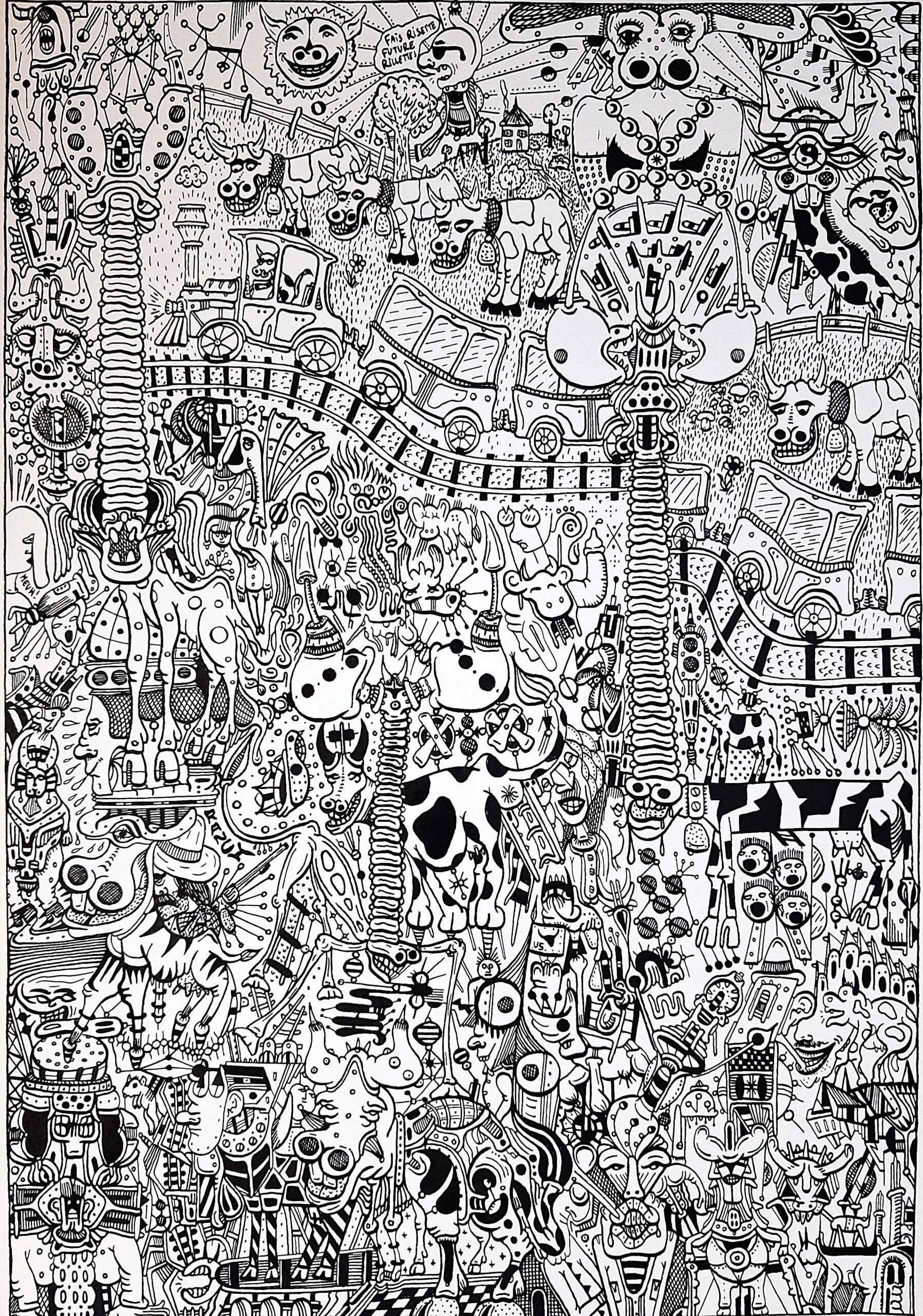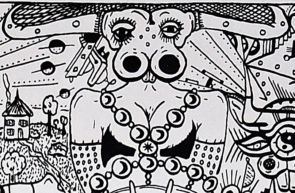 Ses œuvres toutes en accumulation de personnages, d’historiettes fantastiques et de rappels historiques sont étonnamment bien construites. Trait d’une justesse exceptionnelle, graphisme déroutant par sa rigueur farfelue, incroyable par sa technique euphorisante.