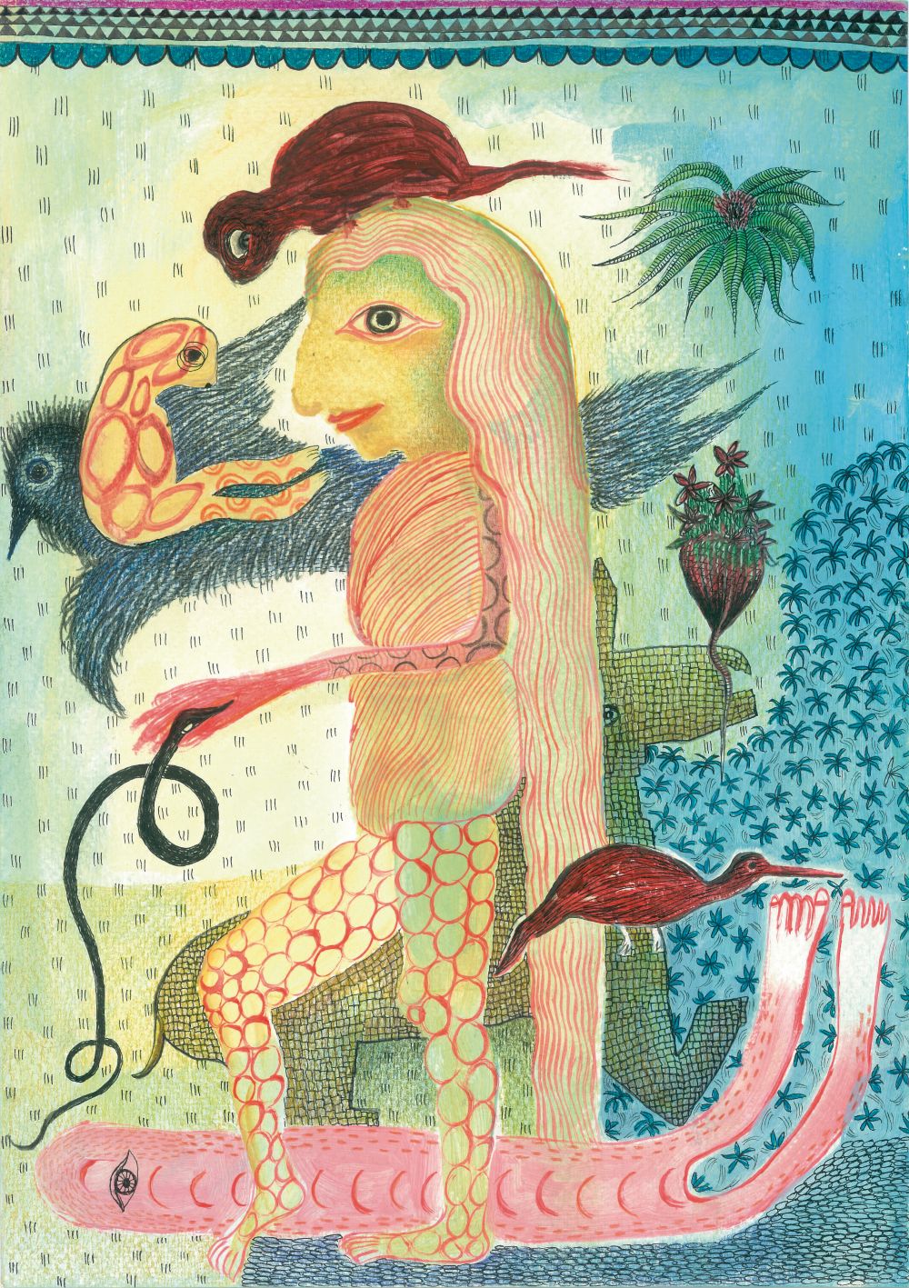 Inspiré par sa seule intuition, elle se laisse guider et ses créatures à la fois humaines et animales sont des parties d’elle-même.