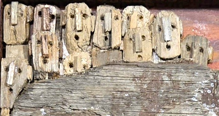Une fois récupérés, les bois flottés sont mis à plat au sol dans un local pendant 2 ou trois semaines afin de les faire bien sécher. Ensuite intervient le temps de la réalisation dans l’atelier où Marc Bourlier a installé un établi. Sur son plan de travail, l’indispensable perceuse, une scie sauteuse, des ciseaux à bois, une collection de couteaux Opinel de différentes tailles, de la colle à bois et des bobines de ficelle de lin. Alors s’engage un dialogue entre lui et ses bois flottés. Trois petits trous, un bout de nez, et le visage prend vie. « Effectivement, c’est moi qui les fais naître, mais je pense qu’ils regardent les personnes qui les regardent. Et peut-être les interrogent-ils : que pensez-vous de moi ? » Il peut raccourcir la pièce, la désépaissir, mais avec le temps, il a appris à intervenir le moins possible. Observez-les bien, ils semblent tous avoir la même couleur… Pas du tout ! Du gris au beige clair en passant par un noir profond, toutes les couleurs de la vie imprègnent ses personnages. « Il n’y en a pas deux de la même couleur, mais ils font partie de la même famille, heureux d’être là. » Au début, il rajoutait des bras, des sexes, un peu de cheveux et il se rend vite compte que c’était de l’ordre de l’anecdote et donc inintéressant. « Pour que l’expression soit la plus directe possible, il faut avoir une écriture la plus simple possible. Moins on en dit, plus il y a d’expression, et plus on va loin. »
