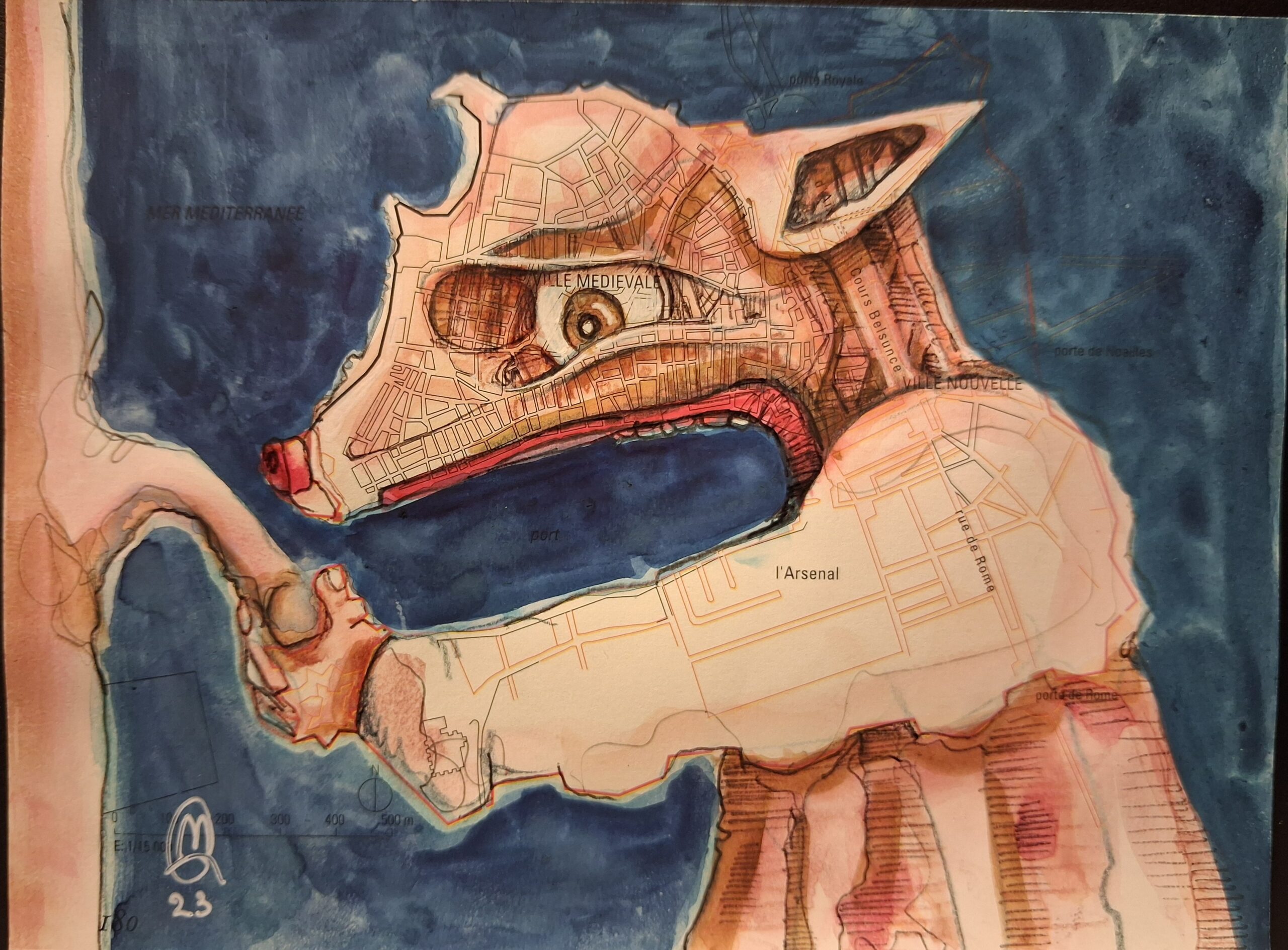 Marcoleptique, champion du détournement  apporte avec ses créations, une nouvelle vie à des documents que plus personne ne regardait. Dans un dialogue qui s’ installe entre l’artiste et  la carte, celle-ci devient source d’ inspiration et contribue à lui révéler, parfois très vite, le thème de son dessin.