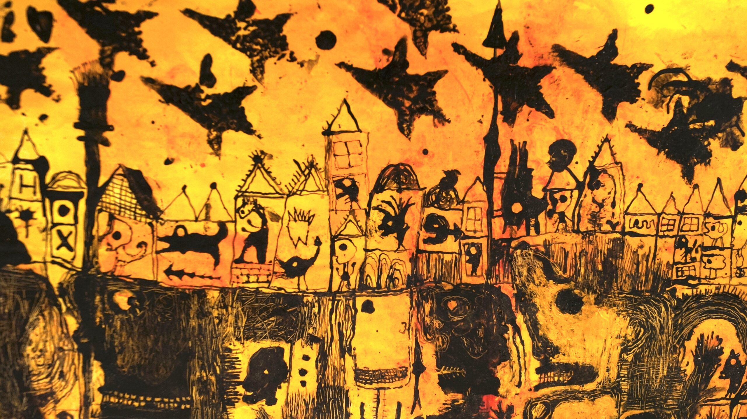 Il y a dans son attitude comme un abandon, loin de toute recherche de perspectives, ou d’un rendement artificiel de la lumière. Ici, tout est donné par l’accouplement des couleurs entre elles. Trois tons : le rouge, le jaune et le noir guident la construction de ses « mondes », comme un daltonien mystique, qui emporterait le spectateur loin de la réalité.