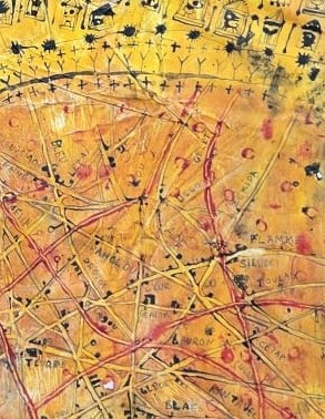 Il y a dans son attitude comme un abandon, loin de toute recherche de perspectives, ou d’un rendement artificiel de la lumière. Ici, tout est donné par l’accouplement des couleurs entre elles. Trois tons : le rouge, le jaune et le noir guident la construction de ses « mondes », comme un daltonien mystique, qui emporterait le spectateur loin  de la réalité.