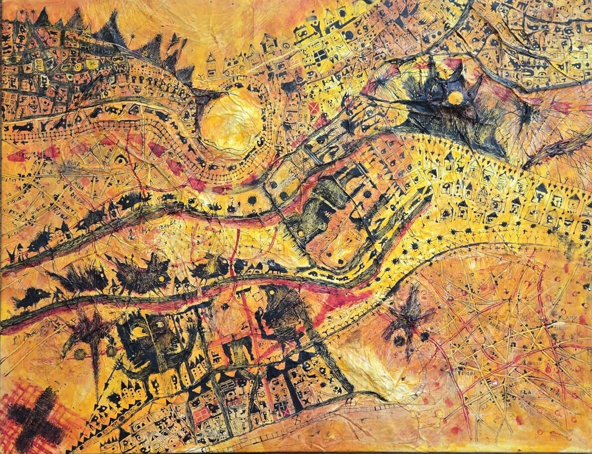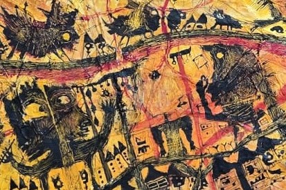 Avec ses couleurs vives, jaunes, rouges, oranges, avec ses formes étranges, êtres humains,  animaux, signes divers Philippe Azema nous  entraine dans le primitif.  Peintre paléolithique des temps modernes il nous plonge dans son monde imaginaire, celui de son enfance.