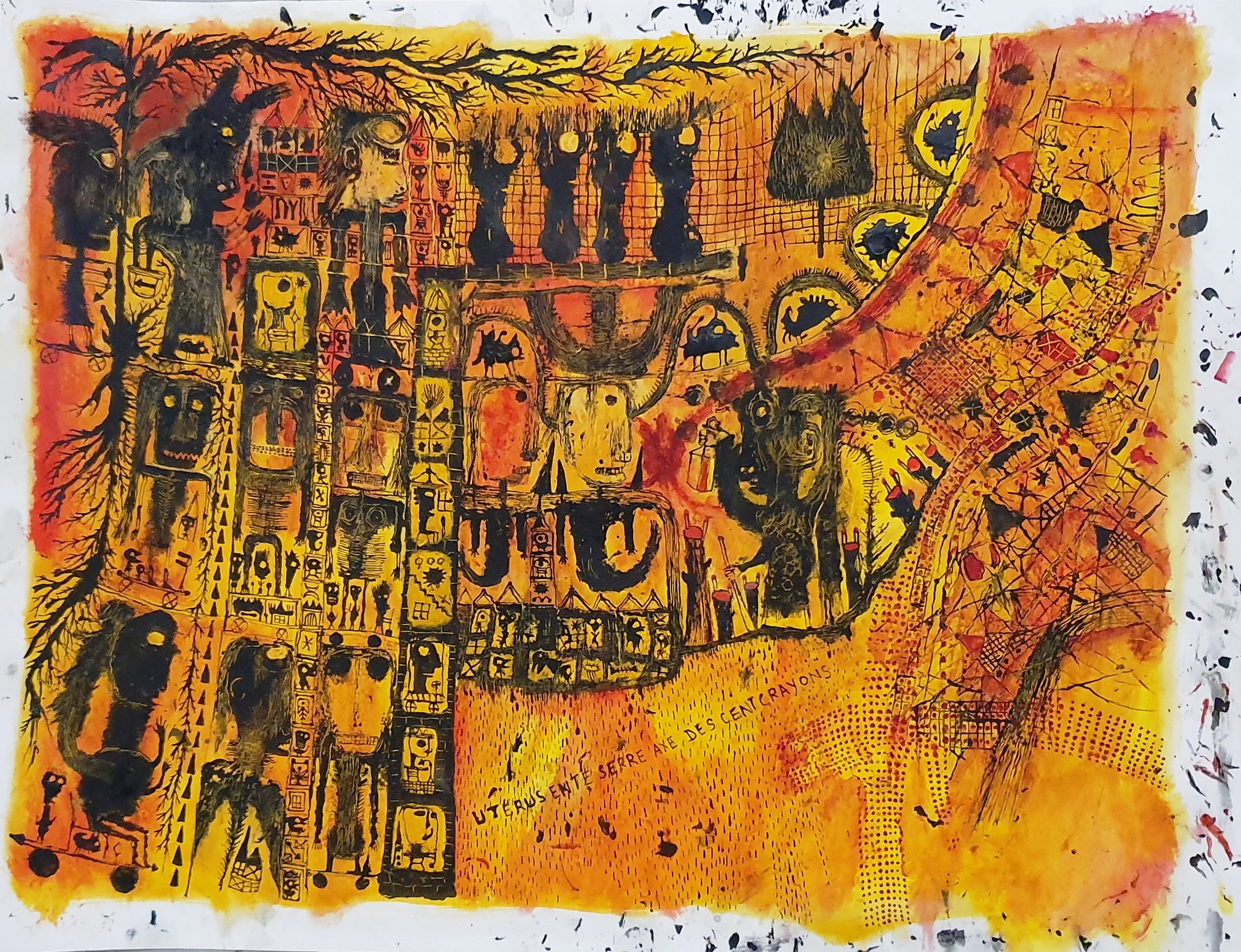 Il y a dans son attitude comme un abandon, loin de toute recherche de perspectives, ou d’un rendement artificiel de la lumière. Ici, tout est donné par l’accouplement des couleurs entre elles. Trois tons : le rouge, le jaune et le noir guident la construction de ses « mondes », comme un daltonien mystique, qui emporterait le spectateur loin de la réalité.