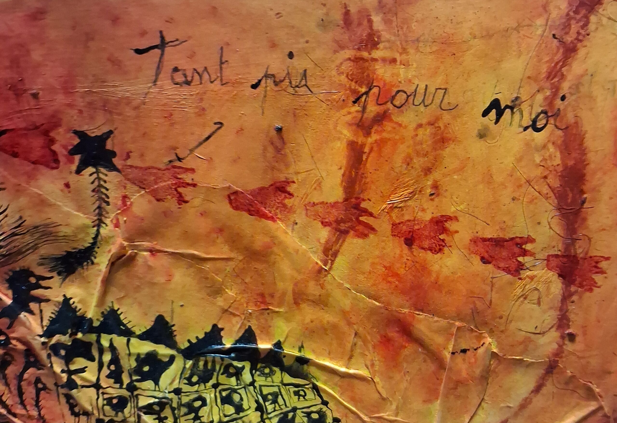 Il y a dans son attitude comme un abandon, loin de toute recherche de perspectives, ou d’un rendement artificiel de la lumière. Ici, tout est donné par l’accouplement des couleurs entre elles. Trois tons : le rouge, le jaune et le noir guident la construction de ses « mondes », comme un daltonien mystique, qui emporterait le spectateur loin  de la réalité.