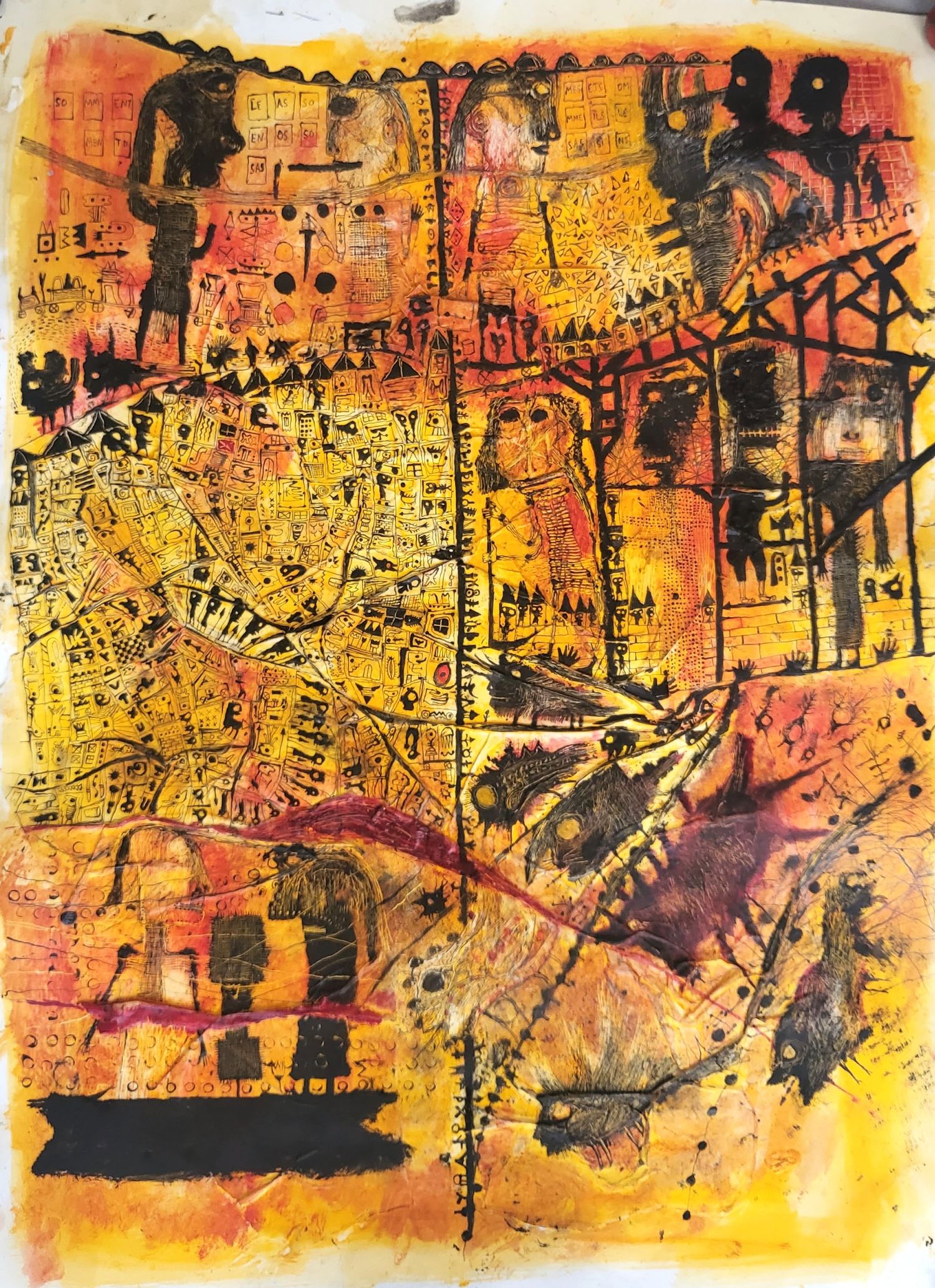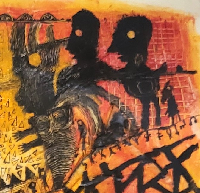 Avec ses couleurs vives, jaunes, rouges, oranges, avec ses formes étranges, êtres humains,  animaux, signes divers Philippe Azema nous  entraine dans le primitif.  Peintre paléolithique des temps modernes il nous plonge dans son monde imaginaire, celui de son enfance.
