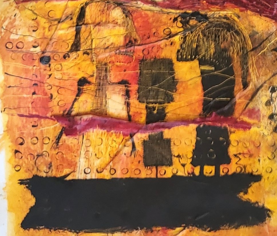 Il y a dans son attitude comme un abandon, loin de toute recherche de perspectives, ou d’un rendement artificiel de la lumière. Ici, tout est donné par l’accouplement des couleurs entre elles. Trois tons : le rouge, le jaune et le noir guident la construction de ses « mondes », comme un daltonien mystique, qui emporterait le spectateur loin  de la réalité.