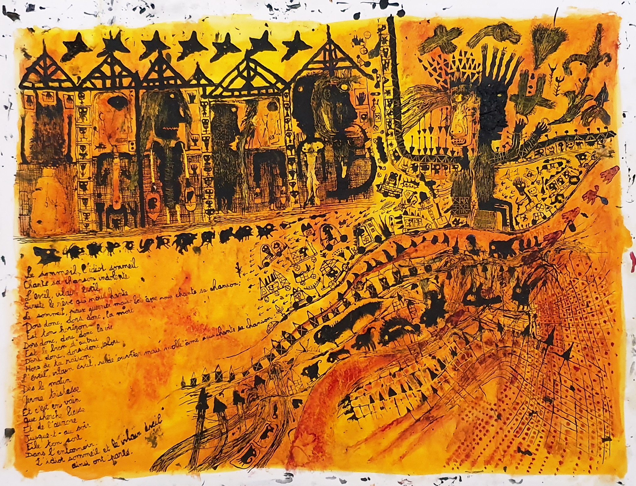 Il y a dans son attitude comme un abandon, loin de toute recherche de perspectives, ou d’un rendement artificiel de la lumière. Ici, tout est donné par l’accouplement des couleurs entre elles. Trois tons : le rouge, le jaune et le noir guident la construction de ses « mondes », comme un daltonien mystique, qui emporterait le spectateur loin de la réalité.