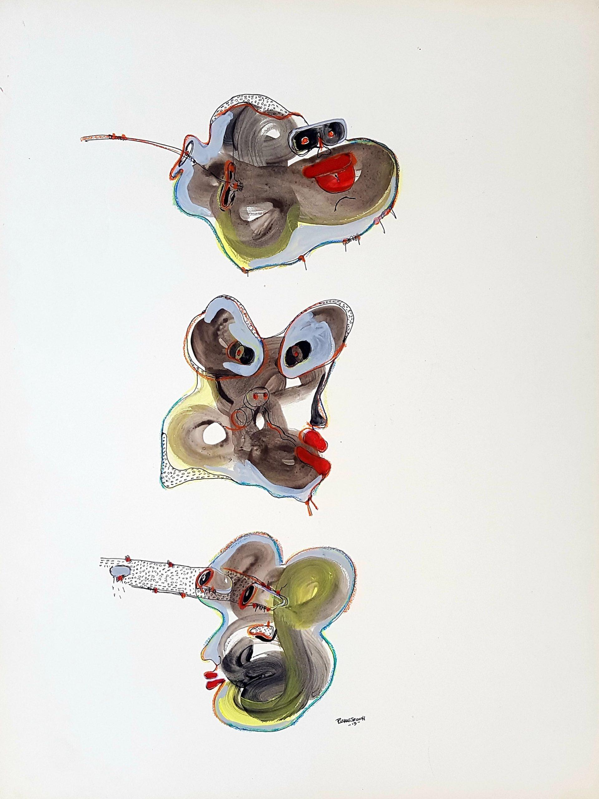 Dans de nombreuses cérémonies Africaines, l’Homme est supposé pouvoir se changer en l’animal dont il porte le masque. Chez Pierre SEGOH c’est l’animal qui porte le masque de l’Homme, le masque de l’état de contrôle auquel il a du mal à parvenir tant il ne peut dépasser ses pulsions, ses exigences corporelles. Il veut s’élever mais sa langue est fourchue, il veut parler mais son bec est lié. L’Homme est montré dans sa dualité originelle, écartelé entre son être transcendant et son animalité, écartelé entre le bien et le mal.