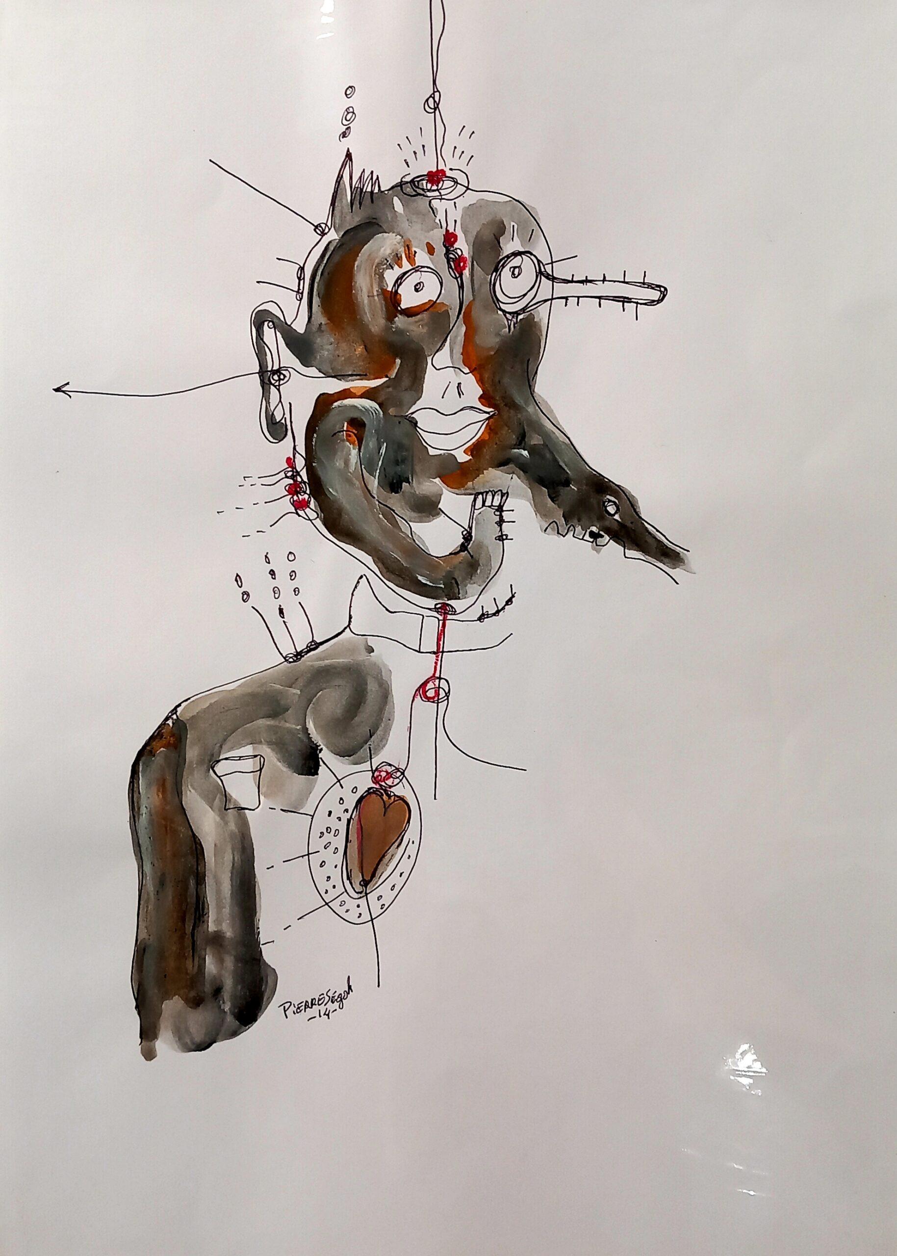 Pierre Segoh peint sur toile, sur papier et sur bois. Il utilise des techniques mixtes de crayons, pastel et encre de chine.