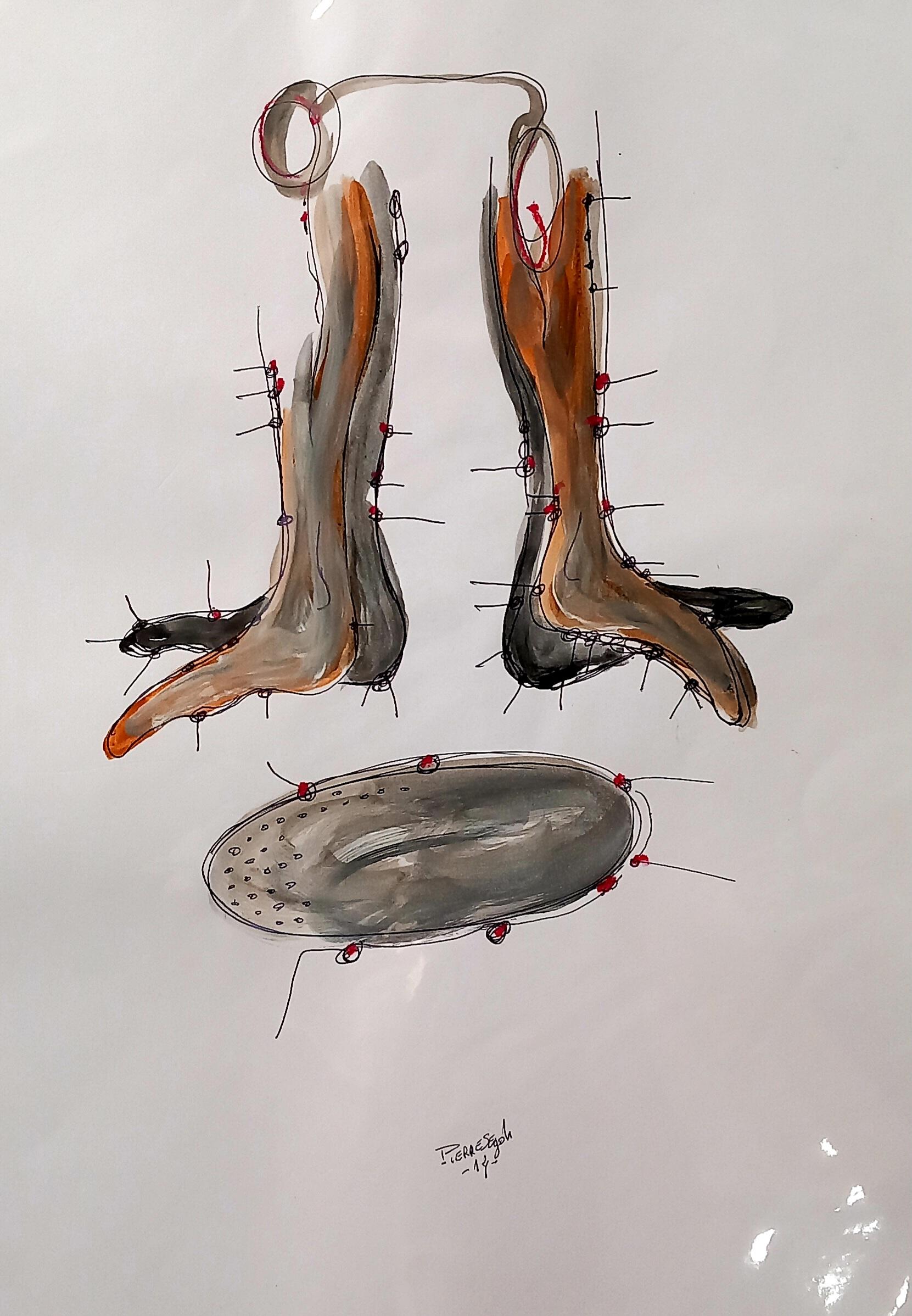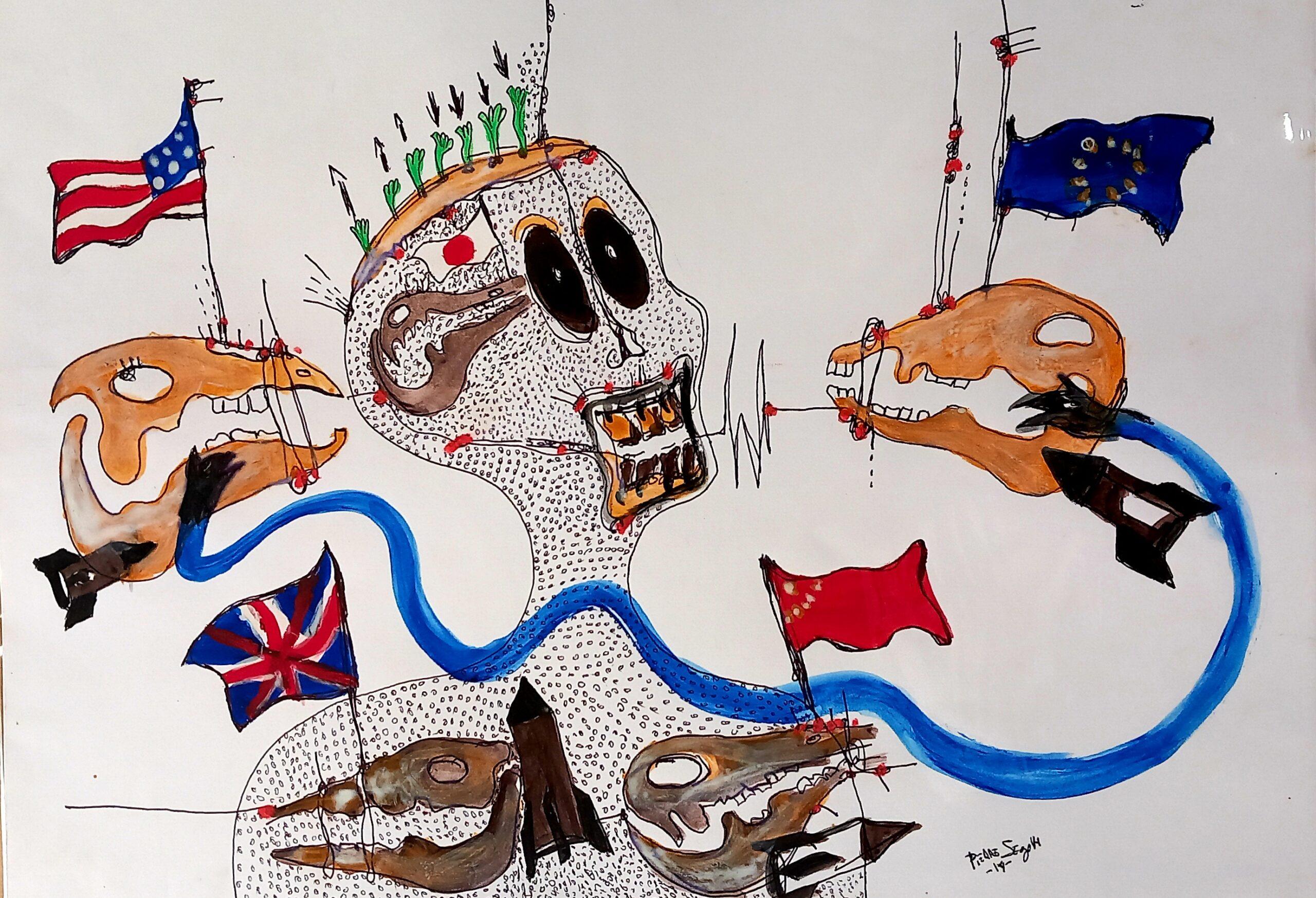 Pierre Segoh peint sur toile, sur papier et sur bois. Il utilise des techniques mixtes de crayons, pastel et encre de chine.