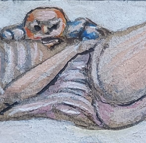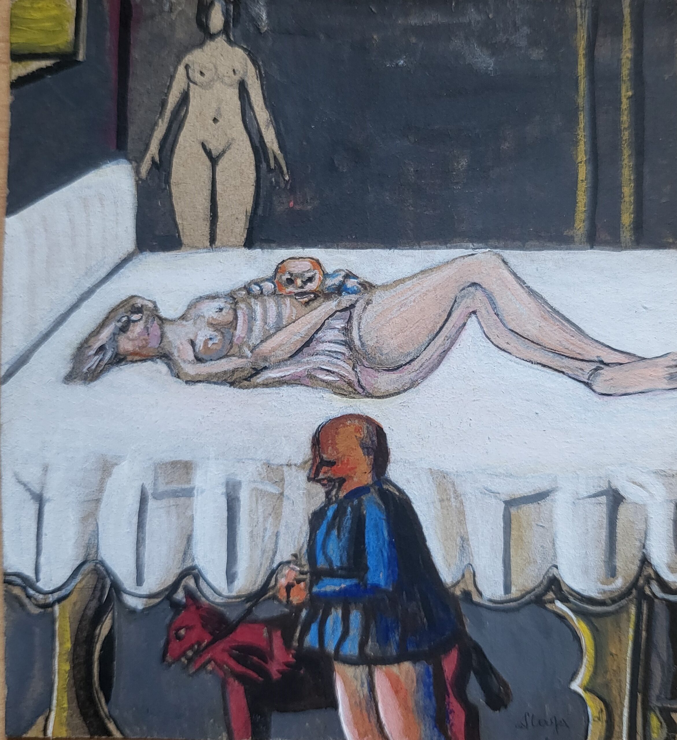 Amadeo Plaza, né à Barcelone en 1929 commence à peindre chez lui à l’âge de 13 ans. Il débute sa vie professionnelle comme peintre en bâtiment, puis dessine des motifs de broderie, réalise des décors de théâtre, fait de la peinture murale, décore des meubles… Il émigre en France en 1957i et dessine des affiches publicitaires. A l’âge de la retraite, c’est à sa propre peinture à laquelle il se consacre, peignant sur carton d’emballage ou papier peint quantité d’icônes miniatures, de saynètes drolatiques ou féroces, de tableaux en réduction traités comme des « grands », de petits portraits d’une force et d’une férocité souvent corrosive. Au fil des œuvres, c’est un véritable musée qui s’élabore, peut être à la manière d’un Borges une civilisation imaginaire, mythologique, cauchemardesque et labyrinthique, mais aussi expressionniste et visionnaire à la manière de Ensor… Amadeo Plaza est un artiste aux multiples facettes et magistralement créatif sur des formats ne dépassant pas parfois un carré de 9 centimètres de côté.