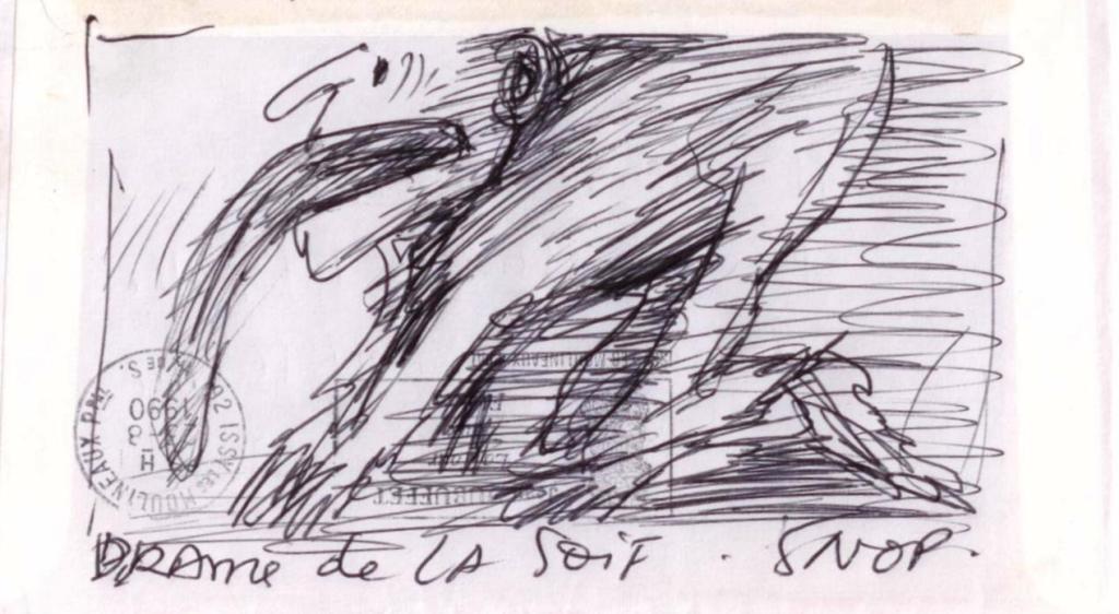 Mélange humoristique entre jeux de langage, à commencer par SNOP l’anagramme de sa signature, dessins zoo-anthropiques, autoportraits, ses créations à l’encre de Chine nous ouvrent les mondes fantastiques, plein d’interrogations, chers à l’artiste.