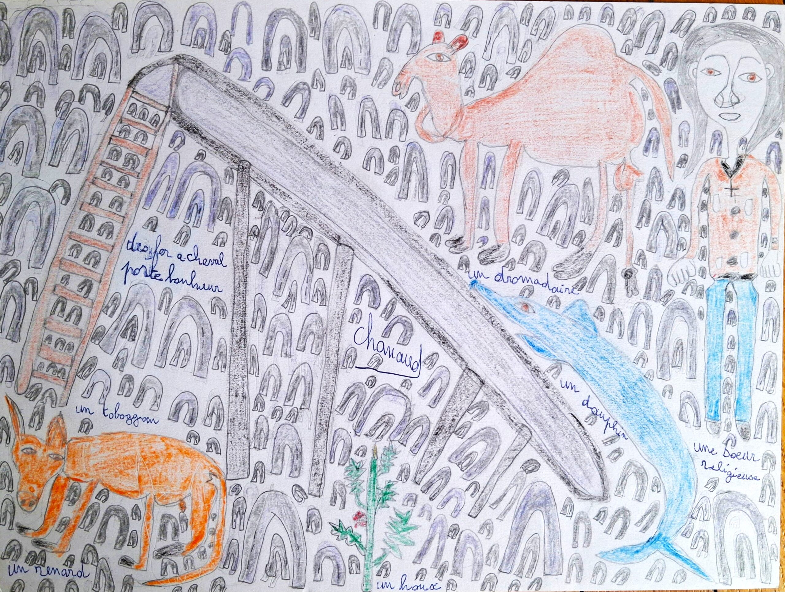 Né en 1956, Thierry : sculpte, marche, dessine et écrit sa vie dans des cahiers d’écolier, compose des chansons qu’il chante et collectionne les cartes postales.