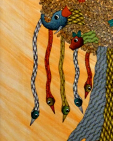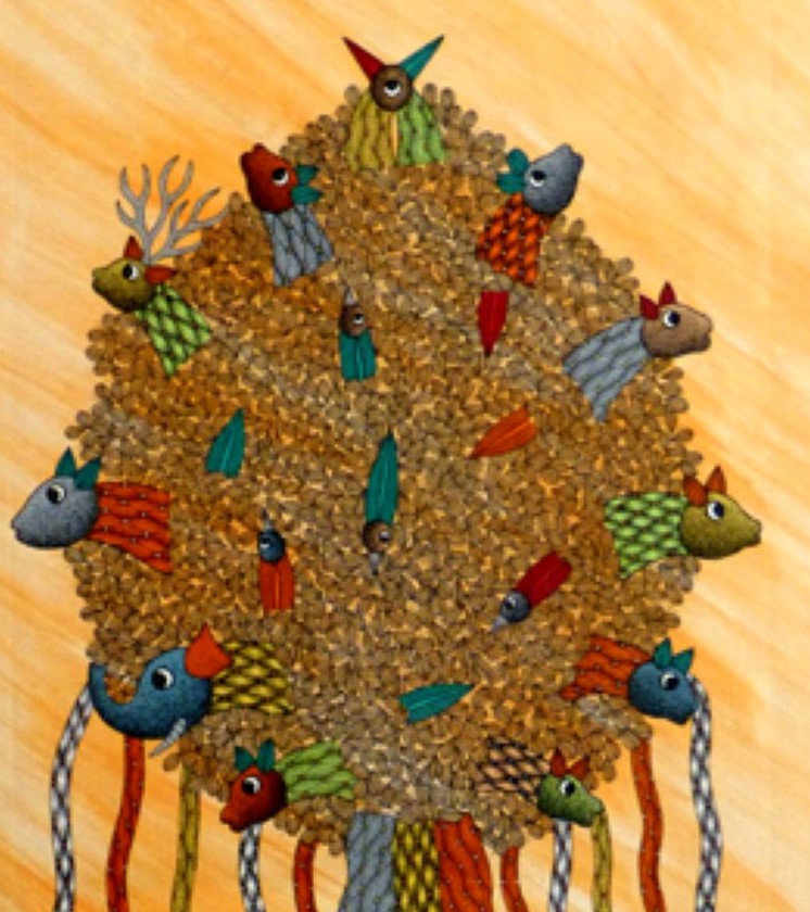 Les Gond n’avaient pas de réelle tradition picturale à l’exception des reliefs d’argile rudimentaire dont les femmes ornaient les murs des maisons avant de les peindre de différentes couleurs. Sous l’impulsion de Jangarh Singh Shyam, artiste de la communauté des » Pardhan » s’ est développé un style collectif, véritable peinture tribale contemporaine, que l’on appelle peinture Gond, Ces peintures mettent en scène des animaux « mutants » dont beaucoup d’oiseaux ainsi que des arbres où séjournent les dieux. De près, ces toiles sont composées des milliers de petits signes colorés dessinés minutieusement. De loin, ils prennent la forme d’êtres vivants dans un univers fantastique.