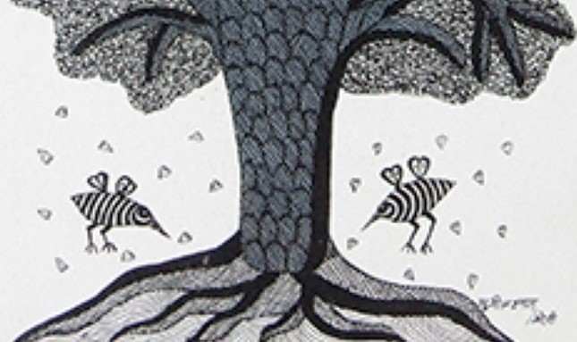 Sunil Shyam appartient à la tribu Gond. Issu directement de la famille du grand maître Jangarh Shyam, il est maintenant installé à Bhopal dans le Madhya Pradesh. Il n’hésite pas à rompre avec les codes pictographiques de sa communauté et préfère les illustrations monochromes aux effets multicolores des œuvres de ses confrères.