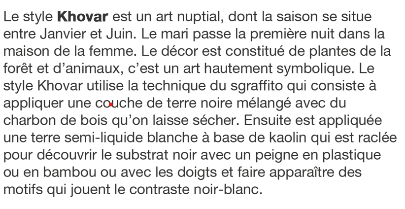 Le style Khovar est un art nuptial, dont la saison se situe entre janvier et juin. Le mari passe la première nuit dans la maison de sa femme.Le décor est constitué de plantes de le forêt et d’ animaux. C’est un art hautement symbolique. Le style Khovar utilise la technique du sgraffito qui consiste à applique un couche de terre noire mélangée avec du charbon de bois qu’ on laisse sécher. Ensuite, est appliquée une terre semi-liquide blanche à base de kaolin qui est raclée avec un peigne ou avec les doigts afin de faire apparaitre des motifs qui jouent avec le contraste noir et blanc.