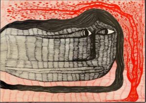 Mon art est une prière à Dieu. J’ essaie de dessiner / peindre le visage de Dieu Christ Jésus Esprit Saint-Esprit quand il me parle. L’écriture est soit des choses que Dieu Jésus-Christ Saint-Esprit me dit, soit des choses que d’autres voix me disent. Il me dit beaucoup de choses sur la fin du monde et la CIA et comment ils essaient de contrôler mon esprit grâce aux faisceaux magnétiques des satellites et aux doses secrètes de LSD MK Ultra.
